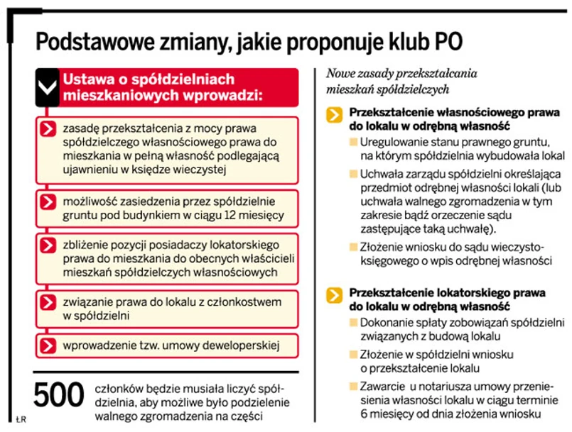 W najbliższych dniach do Sejmu trafią dwa rewolucyjne projekty nowych ustaw spółdzielczych, przygotowanych przez klub Platformy Obywatelskiej. Największe zmiany dotyczą spółdzielni mieszkaniowych. We wszystkich przypadkach, gdy posiadają one własność lub użytkowanie wieczyste gruntu pod wybudowanym budynkiem, możliwe będzie przekształcenie spółdzielczego własnościowego prawa do lokalu w odrębną własność z mocy prawa.