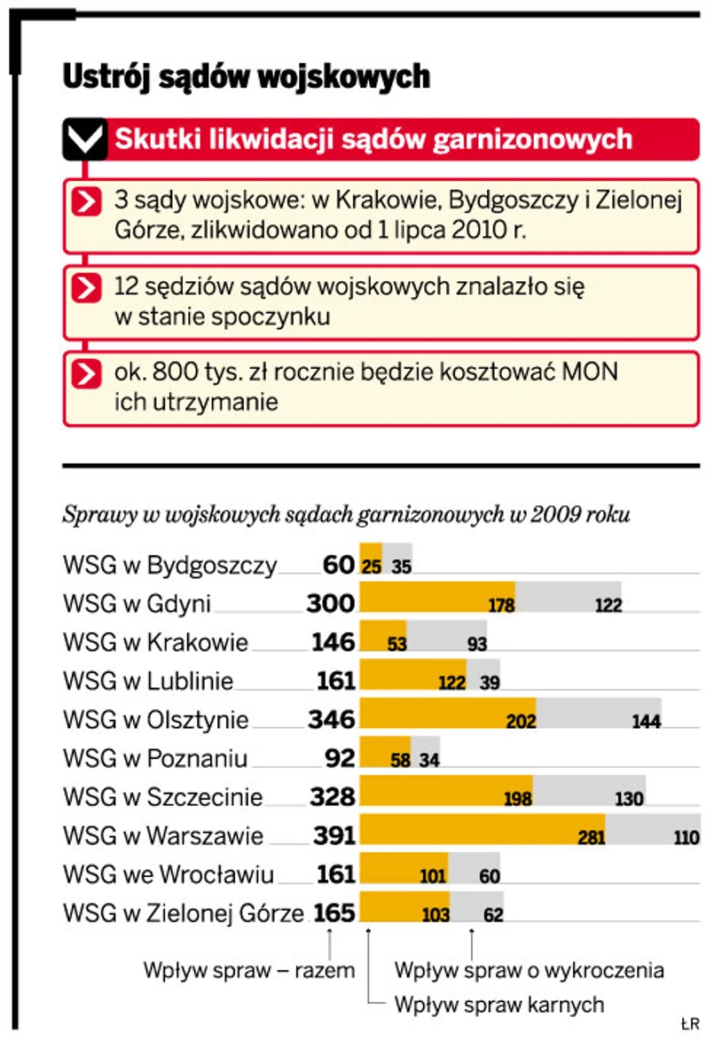 Wcześniej wszystkie te sprawy rozpatrywali sędziowie za zlikwidowanego sądu garnizonowego w Krakowie. Ale to nie koniec mitręgi. Sprawy, w których w I instancji właściwy jest wojskowy sąd okręgowy (dotyczące np. starszych oficerów lub żołnierzy w stopniu majora lub wyższym), kierowane są do kolejnych dwóch sądów: Wojskowego Sądu Okręgowego w Warszawie lub Poznaniu, w zależności od tego, czy sprawca podlega jednostce położonej na terenie województwa małopolskiego, czy świętokrzyskiego.