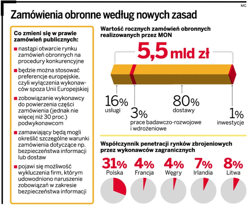 Implementacja dyrektywy i, co za tym idzie, otwarcie krajowych rynków obronnych to przede wszystkim szansa dla polskich przedsiębiorców. Należy bowiem pamiętać, że dyrektywa obronna powoduje otwarcie na konkurencję nie tylko polskiego rynku zamówień w dziedzinie obronności i bezpieczeństwa, ale też rynków pozostałych państw członkowskich UE. Polskie przedsiębiorstwa będą musiały konkurować o zamówienia w Polsce (na dziś ponad 30 proc. zamówień jest udzielanych wykonawcom zagranicznym), zyskują jednak możliwość ubiegania się o tego rodzaju zamówienia również na dotychczas niedostępnych rynkach pozostałych państw UE. Otwarcie rynku zamówień obronnych na konkurencję to również szansa na poprawę sytuacji małych i średnich przedsiębiorstw, które dotąd miały ograniczony dostępu do tego rodzaju zamówień nawet na rynku polskim. Jednocześnie jest to wyzwanie dla polskich firm. Dużo zależy od tego, czy zechcą skorzystać z szansy, jaka się przed nimi otwiera, i czy będą w stanie sprostać wyzwaniom, jakie wiążą się z koniecznością działania w warunkach zwiększonej konkurencji.