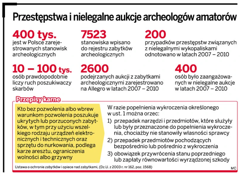 Zgodnie z przepisami ustawy o ochronie zabytków i opiece nad nimi zabytki znalezione w ziemi należą do Skarbu Państwa. By rozpocząć legalne poszukiwania, trzeba zgromadzić wiele dokumentów. Kto prowadzi poszukiwania bez nich, zapłaci grzywnę, zostanie skazany na karę ograniczenia wolności lub aresztu. Do wniosku o pozwolenie na prowadzenie badań archeologicznych trzeba jednak dołączyć m.in. mapy, dokumenty potwierdzające gotowość muzeum do przyjęcia ewentualnie odkrytych zabytków i dokumenty potwierdzające kwalifikacje osoby prowadzącej wykopaliska. To zniechęca poszukiwaczy skarbów. – Te czynności trwają miesiącami, a po 20 minutach poszukiwań może się okazać, że na polu nic nie ma – komentuje inny poszukiwacz.