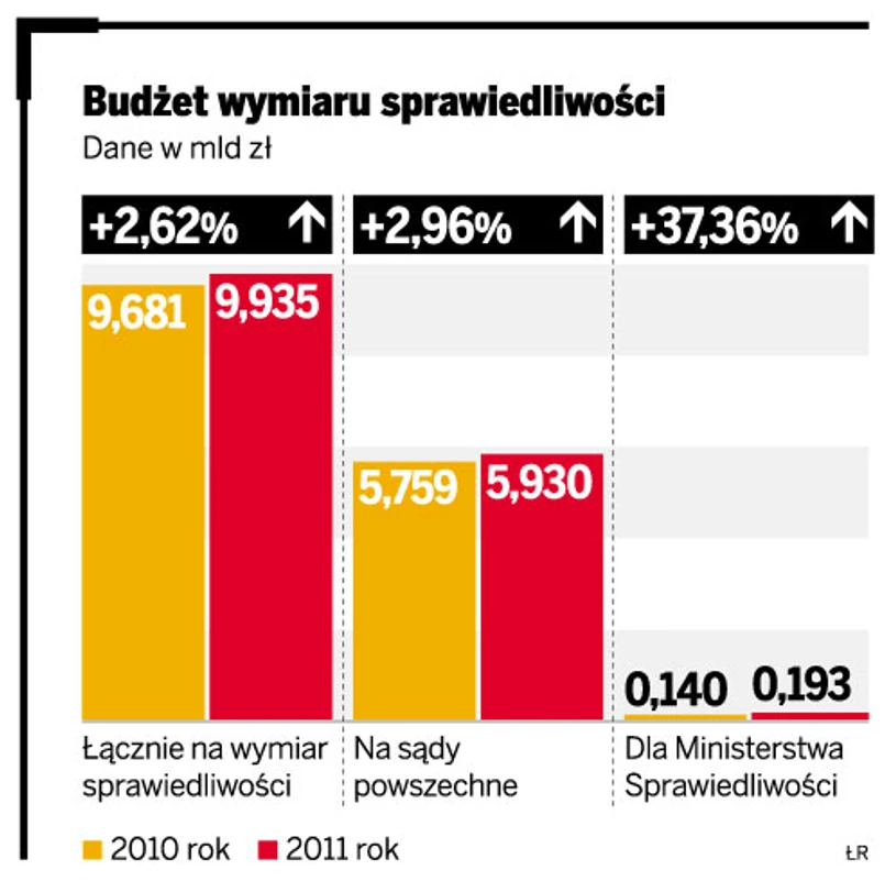 Planowany budżet na rok 2011 przewiduje, że wydatki związane z wymiarem sprawiedliwości będą wyższe niż w ubiegłym roku. W przyszłym roku wyniosą prawie 10 mld zł i będą większe o ponad 250 mln zł w stosunku do tych z roku 2010. Jest to wzrost o ponad 2,6 proc. Uwzględnia on między innymi podwyżki dla sędziów. Sędziowie jednak podkreślają, że wzrost wynagrodzeń złagodzi jedynie skutki inflacji. Brakiem podwyżek rozczarowani są natomiast asystenci sędziów. Zapowiadają, że efektem tego będą odejścia z zawodu.
