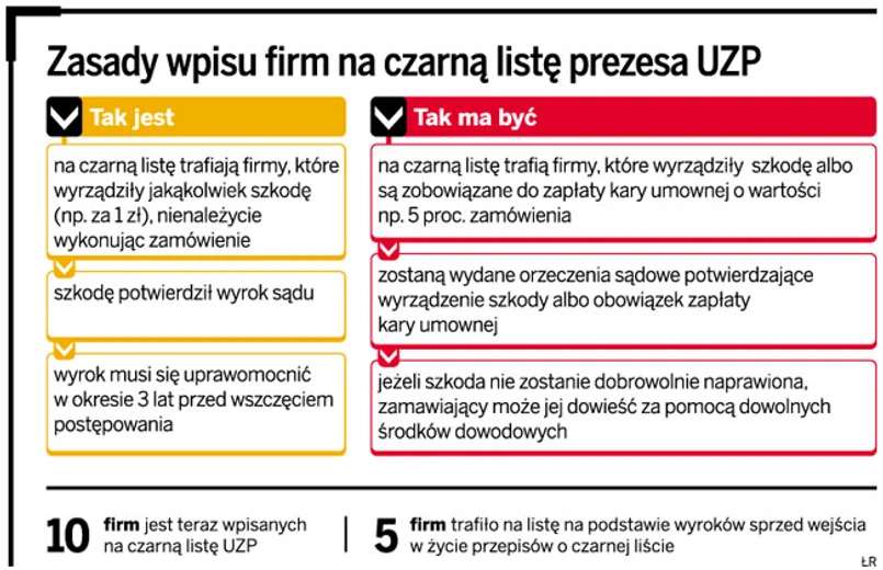 Problem proporcjonalności sankcji dostrzegł także UZP. Zaproponował w założeniach do nowelizacji, aby na czarną listę wpisywani byli wykonawcy, którzy wyrządzą szkodę o wartości 5 proc. zamówienia.