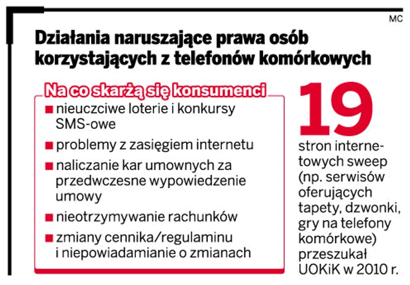 Do Urzędu Ochrony Konkurencji i Konsumentów wpłynęło kilkaset skarg konsumentów na działania nieuczciwych operatorów telefonii komórkowej. Dodatkowo urząd regularnie przeszukuje strony internetowe typu sweep (sprzedających gadżety na telefony komórkowe, np. dzwonki czy tapety).