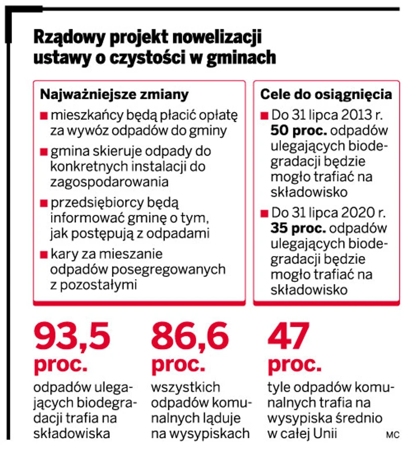 Przejęcie odpadów komunalnych przez gminy ma sprawić, że w Polsce zaczną funkcjonować recykling i odzysk odpadów. Obecnie ponad 86 proc. wszystkich śmieci ląduje na wysypiskach i nic się z nimi nie dzieje. W dodatku około 93,5 proc. odpadów, które ulegają biodegradacji, także trafia na wysypiska. Tymczasem Unia Europejska wymaga, by już dziś takich odpadów było składowanych nie więcej niż 75 proc. Za zaległości grożą nam wysokie kary. Polska może zostać ukarana kwotą 4 mln euro. To kara jednorazowa i dochodzą jeszcze sankcje finansowe za każdy dzień opóźnienia w realizacji unijnych wytycznych – nawet 300 tys. euro.