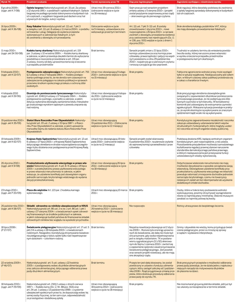 Zebraliśmy co najmniej kilkanaście wyroków (patrz tabela) sądu konstytucyjnego, które nie mogą doczekać się realizacji w postaci nowelizacji ustaw, są odkładane na bliżej nieokreśloną przyszłość, albo ustawodawca nie przesądza jednoznacznie, jak je interpretować, przez co muszą robić to obywatele i sądy. Mamy też przykład całkowitej ignorancji. Ustawodawca wprowadza do prawa przepis, który wcześniej trybunał zakwestionował.
