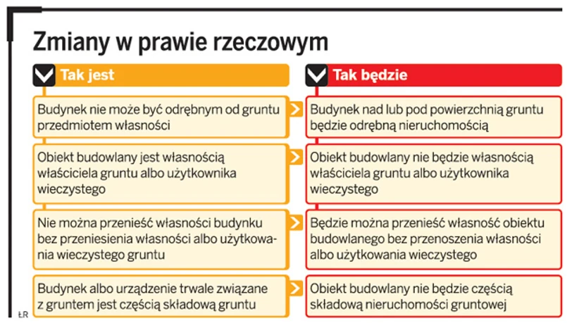 Budynek wybudowany nad lub pod powierzchnią nieruchomości nie będzie musiał już należeć do właściciela albo do użytkownika wieczystego gruntu. Ministerstwo Infrastruktury chce wprowadzić nowy, nieznany do tej pory rodzaj nieruchomości – odrębną własność obiektów budowlanych – która będzie stanowiła osobny od gruntu przedmiot własności. Odrębnymi obiektami budowlanymi będą np. budynki, budowle, tunele, wiadukty, mosty i parkingi wznoszone nad lub pod drogami publicznymi, liniami kolejowymi czy też nad wodami.