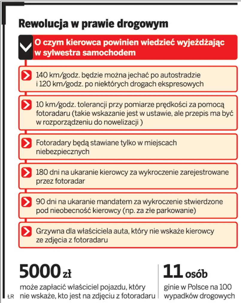 Kierowców ucieszy zapewne fakt, że fotoradary będą rejestrować przekroczenie prędkości, dopiero jak ustalony w danym miejscu limit zostanie przekroczony o 10 km/godz. Oznacza to, że np. w mieście fotoradar zrobi zdjęcie, gdy kierowca przekroczy 60 km/godz., a nie tylko 50 km/godz. Jednak tolerancja ta nie dotyczy innych urządzeń rejestrujących prędkość. Dlatego można liczyć, że takie łagodniejsze podejście będzie tylko ze strony Inspekcji Transportu Drogowego i straży miejskiej. Policja natomiast nie musi uwzględniać tej tolerancji przy wykorzystaniu radaru czy wideorejestratora. W dodatku ustawodawca tolerancję do 10 km/godz. umieścił w wytycznych dla ministra infrastruktury, by taki zapis pojawił się w rozporządzeniu do nowelizacji.