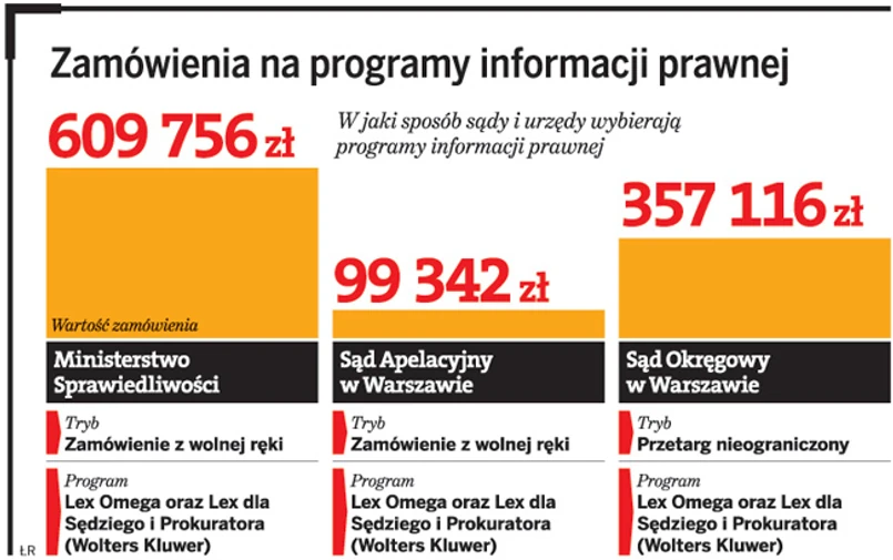 Sądy i prokuratury same we własnym zakresie organizują procedury wyboru programów informacji prawnej. Jednak ministerialna umowa zachęca je do korzystania z usług wybranego przez resort wydawnictwa. Dzieje się tak za sprawą klauzuli, która znalazła się w umowie. Zgodnie z nią licencjodawca (wydawnictwo) oświadcza, że w okresie obowiązywania umowy z ministerstwem utrzyma warunki dostawy, ceny i inne uzgodnienia wynegocjowane przez ministerstwo także dla pozostałych jednostek resortu. W praktyce więc wiele sądów, powołując się na te warunki, zawiera – często także z wolnej ręki – umowę z wydawnictwem wybranym przez resort. Przykładem może być tu Sąd Apelacyjny w Warszawie, który przeprowadził z wolnej ręki aktualizację baz prawnych zainstalowanych w 2000 r. – wyjaśnia sędzia Barbara Trębska, rzecznik prasowy tego sądu.