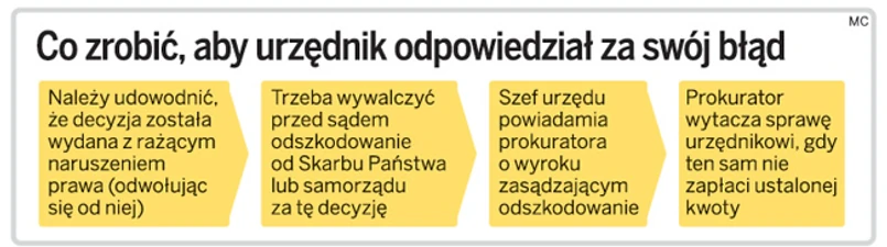 Aby pociągnąć urzędnika do odpowiedzialności, konieczne będzie przyznanie obywatelowi odszkodowania za szkodę wyrządzoną z rażącym naruszeniem prawa. Jej źródłem musi być zawinione działanie lub zaniechanie urzędnika. Wówczas szef urzędu będzie musiał przesłać prokuraturze odpis wyroku wraz z aktami sprawy i wnioskiem o wszczęcie postępowania wyjaśniającego. Jeśli tego zaniecha, sam poniesie odpowiedzialność. Zadaniem prokuratora będzie ustalenie, który urzędnik dopuścił się rażącego naruszenia prawa. Jeżeli stwierdzi, który funkcjonariusz popełnił błąd, wytoczy mu sprawę. Przed złożeniem pozwu prokurator da urzędnikowi szansę dobrowolnej zapłaty żądanej kwoty. Gdy środki w wyznaczonym terminie nie wpłyną na konto Skarbu Państwa, sprawę rozpozna sąd.