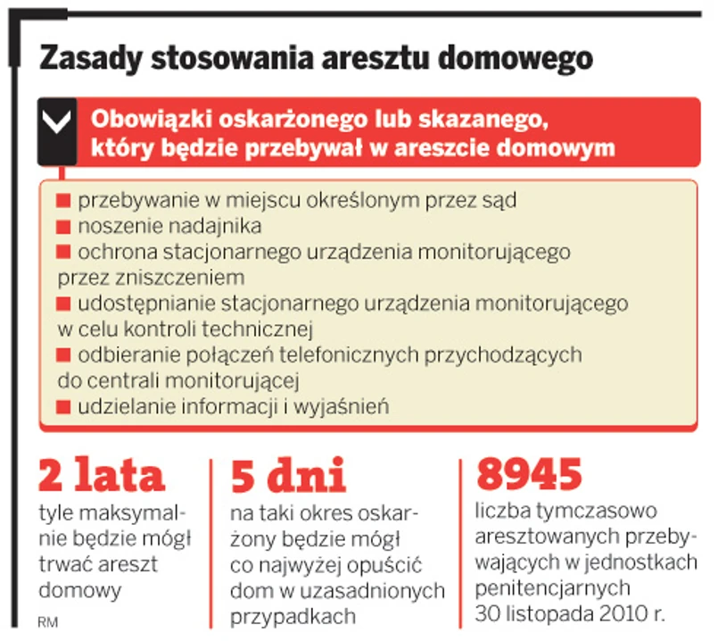 Skorzystanie z nowych możliwości mają zagwarantować przygotowywane przez resort sprawiedliwości zmiany w przepisach karnych. Przewidują one wprowadzenie do polskiej procedury nowego środka w postaci aresztu domowego. Jego istotą będzie stałe przebywanie oskarżonego w miejscu wskazanym w postanowieniu