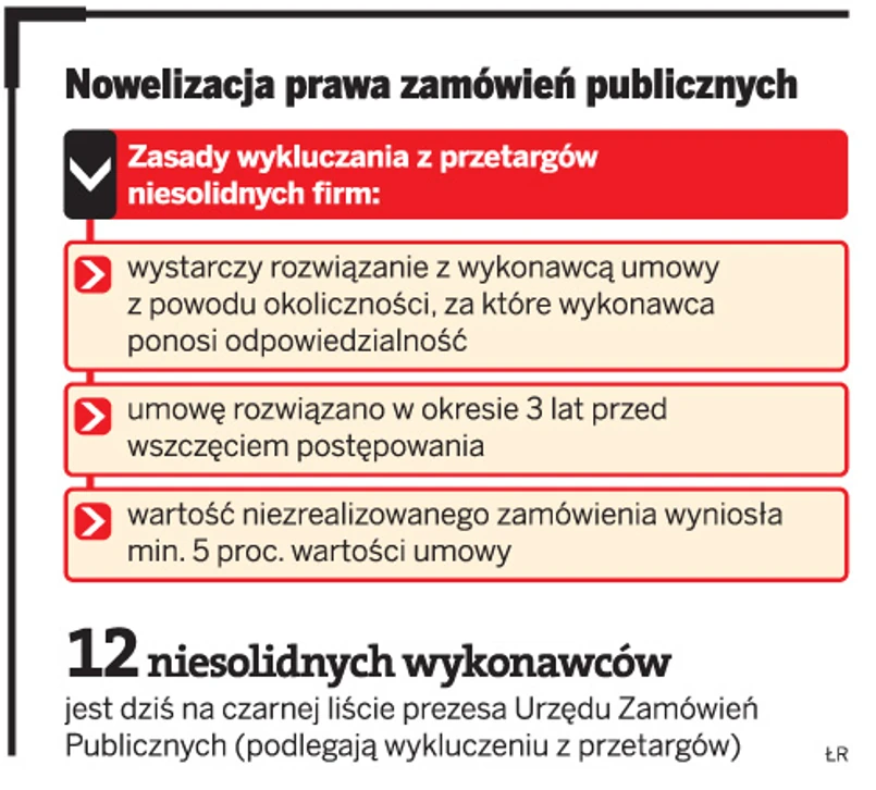 Jej zdaniem rozwiązanie jest bardzo niebezpieczne i sprzeczne z prawem europejskim. Zgodnie z dyrektywą 2004/18/WE z postępowania można wykluczyć wykonawcę, który jest winien poważnego wykroczenia zawodowego. – Nie chodzi więc tu o jakikolwiek przypadek niewykonania umowy, ale o przypadek kwalifikowanego niewykonania umowy (poważne wykroczenie) – uważa Ewa Maciuk.