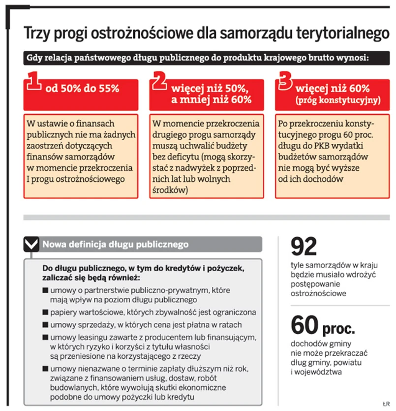 Tymczasem dane dotyczące sytuacji finansowej samorządu nie napawają optymizmem. To może spowodować, że coraz więcej sa- morządów może mieć problem z regulowaniem swoich zobowiązań. Jak wynika ze specjalnego zestawienia przygotowanego przez Krajową Radę Regionalnych Izb Obrachunkowych (KR RIO), aż 92 samorządy są zagrożone koniecznością wdrożenia postępowań oszczędnościowych przewidzianych w ustawie o finansach publicznych. Efektem tego będzie konieczność szybkiego wdrożenia cięć w wydatkach, w tym tych przeznaczonych na inwestycje. Wszystko za sprawą obowiązującego od 1 stycznia tego roku rozporządzenia ministra finansów w sprawie szczegółowego sposobu klasyfikacji tytułów dłużnych zaliczanych do państwowego długu publicznego. Przepisy te wprowadzają nowe zasady obliczania długu. Zgodnie z nimi do długu samorządów zaliczane będą zobowiązania powstające w wyniku bezpośredniego udzielenia pożyczki przez dostawców lub producentów na transakcje dotyczące wyrobów i usług.