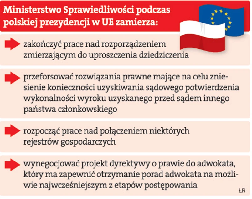 Wiceminister zapowiada, że podczas polskiej prezydencji w pracach Rady UE, która rozpocznie się 1 lipca, resort sprawiedliwości chce również zakończyć prace nad projektem rozporządzenia w sprawie dziedziczenia i europejskiego certyfikatu spadkowego. Wprowadza ono zasadę, według której właściwy do rozpatrzenia sprawy spadkowej będzie sąd kraju, w którym spadkodawca w chwili śmierci faktycznie mieszkał. Sąd ten będzie prowadził postępowania dotyczące całego spadku, niezależnie od tego, w ilu krajach spadkodawca pozostawił majątek.