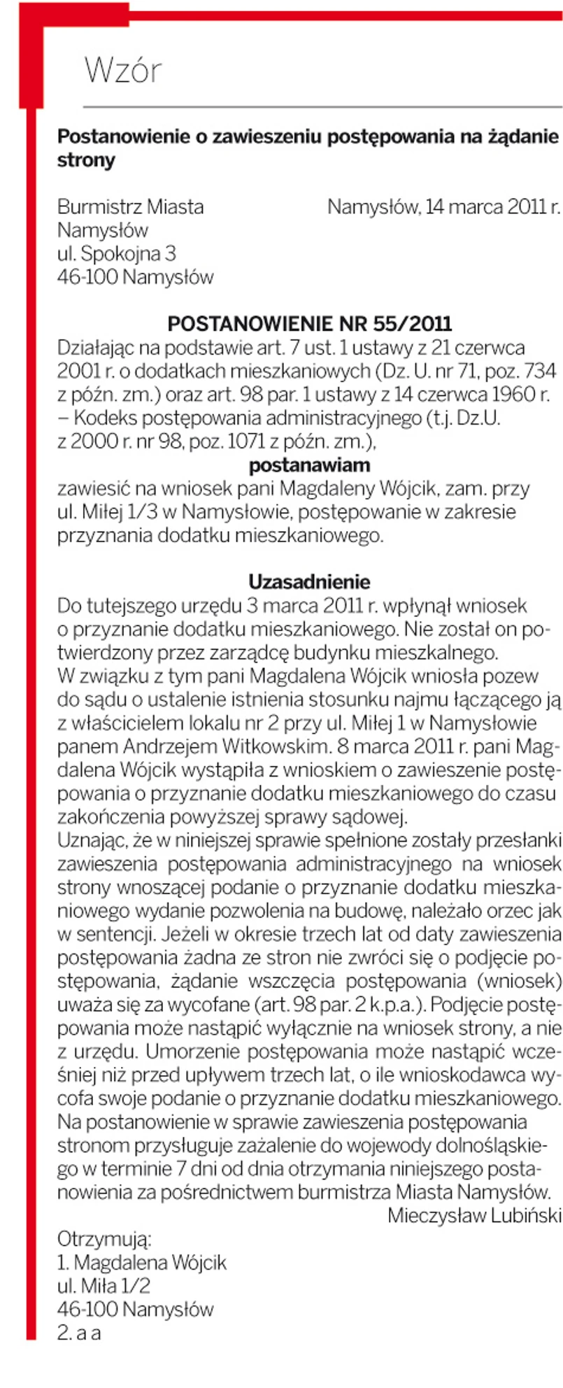 Organ stwierdza spełnienie warunków zawieszenia postępowania w postanowieniu. Zgodnie z art. 101 par. 3 k.p.a. stronie służy zażalenie na postanowienie w sprawie zawieszenia postępowania, chodzi tu więc nie tylko o postanowienie o odmowie zwieszenia, ale też o postanowienie o zawieszeniu postępowania. Z kolei przepis art. 101 par. 2 k.p.a. nakłada na organ administracji publicznej obowiązek pouczenia strony (a w razie wielości stron wszystkich stron postępowania), na której żądanie zawieszono postępowanie, o skutkach prawnych upływu trzech lat od daty zawieszenia postępowania. Pouczenie to powinno zostać zawarte w postanowieniu o zawieszeniu postępowania. Jest to obligatoryjny element tego aktu administracyjnego.