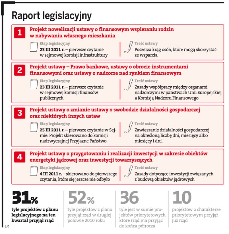 W pierwszym kwartale 2011 roku rząd przyjął 18 projektów ustaw. W planie legislacyjnym znalazło się natomiast 58 projektów zmian w przepisach. Oznacza to więc, że Rada Ministrów wykonała swój plan jedynie w 31 proc. Do końca tego półrocza rząd planuje przyjąć łącznie 95 projektów ustaw. Wśród niech jest 36 priorytetowych, z czego w pierwszym kwartale miało być przyjętych 20. Tymczasem rządowi udało się przyjąć dziesięć spośród nich. W dodatku – mimo zapewnień ze strony rządu, że projekty oznaczone jako priorytetowe będą procedowane najszybciej – w marcu tylko jeden taki projekt trafił na Radę Ministrów. Była to nowa ustawa o wdrożeniu naziemnej telewizji cyfrowej.