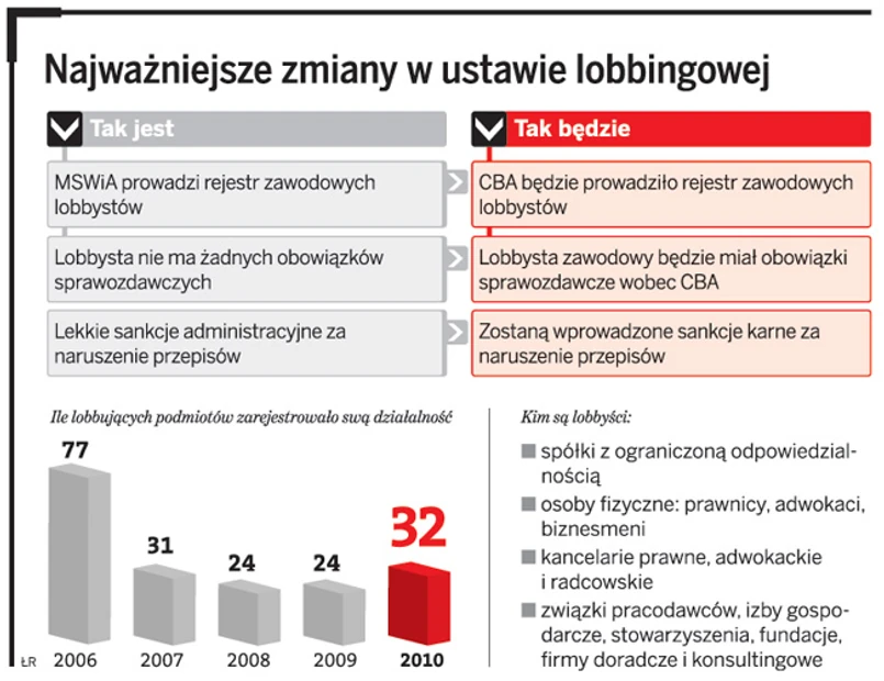 Każdy z zawodowych lobbystów będzie musiał co roku wysyłać do CBA sprawozdanie. A w nich szczegółowo będzie musiał informować nie tylko o swych zleceniodawcach i osobach lobbowanych, ale również o darowiznach i wpłatach na rzecz kampanii wyborczych. W razie spóźnienia lobbyście będzie groziło wykreślenie z rejestru. O kolejny wpis będzie mógł się ubiegać po upływie jednego roku.