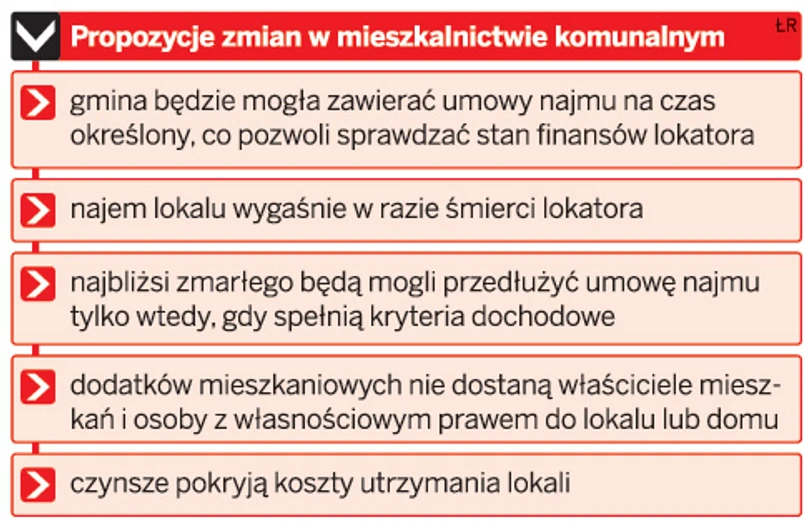 Ministerstwo Pracy i Polityki Społecznej domaga się natomiast informacji o tym, jakie skutki przyniesie pozbawienie właścicieli mieszkań, domów oraz lokali własnościowych w spółdzielniach prawa do dodatków mieszkaniowych. Resort podkreśla, że kwota tego dodatku jest wliczana do dochodów branych pod uwagę przy udzielaniu pomocy społecznej.