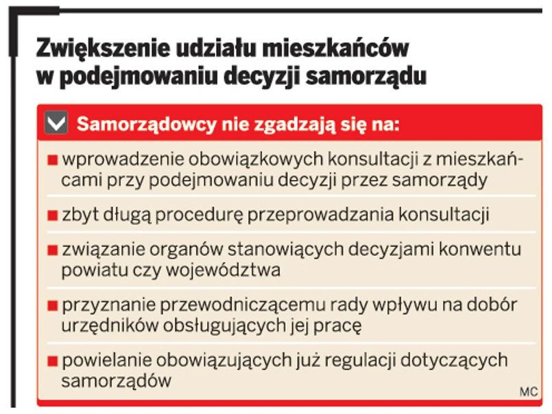 – Na przykład kilkunastu mieszkańców gminy czy powiatu mogłoby bez jakiejkolwiek potrzeby i najmniejszych konsekwencji angażować w sposób ciągły organy samorządu terytorialnego, dziesiątki urzędników i znaczące kwoty na ekspertyzy, raporty itd. – mówi Andrzej Płonka, starosta bielski oraz wiceprezes Związku Powiatów Polskich. Dodaje, że wprowadzenie takich rozwiązań będzie się wiązało ze znaczącym rozbudowaniem administracji samorządowej i dodatkowymi kosztami. Te trzeba będzie przeznaczać na obsługę nowych zadań przewodniczących rad i sejmików województw.