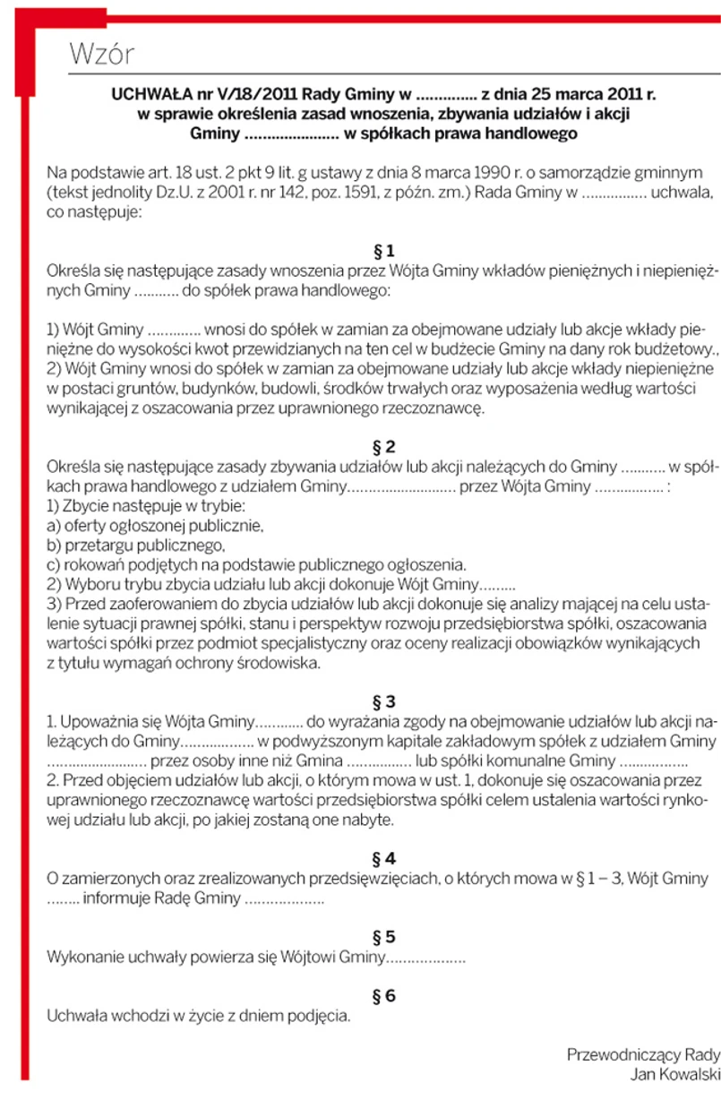 Zgodnie z ustawą o samorządzie gminnym do wyłącznej właściwości rady gminy należy podejmowanie uchwał w sprawach majątkowych gminy, przekraczających zakres zwykłego zarządu, dotyczących określania zasad wnoszenia, cofania i zbywania udziałów i akcji przez wójta (art. 18 ust. 2 pkt 9 lit. g). Co ważne, uchwała musi mieć charakter generalny (por. wyrok Naczelnego Sądu Administracyjnego z 25 stycznia 2011 r., I OSK 1917/2010, LexPolonica nr 2458317). Oznacza to, że wskazany przepis nie stanowi upoważnienia dla organu stanowiącego gminy do podejmowania uchwały w sprawie wyrażenia indywidualnej zgody dotyczącej konkretnie wskazanego podmiotu, Podkreślił to wojewoda małopolski, badając uchwałę rady gminy w sprawie wyrażenia zgody na podwyższenie kapitału zakładowego Przedsiębiorstwa Usług Komunalnych Sp. z o.o. w drodze wniesienia wkładu niepieniężnego i objęcia nowych udziałów (rozstrzygnięcie nadzorcze wojewody małopolskiego z 15 czerwca 2010 r., PN.II.0911-80-10, LexPolonica nr 2435639).