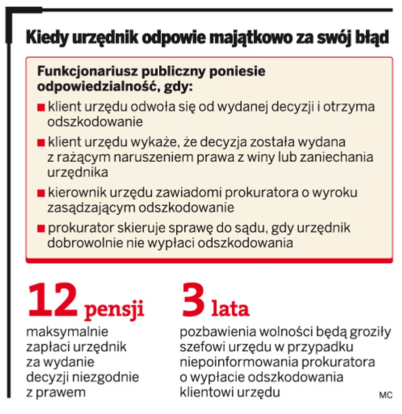 Pomysł jest znany od dawna, ale nowe przepisy co najwyżej upraszczają pewne rzeczy. Mają charakter bardziej wskazujący chęć rozwiązania problemu niż go rozwiązujący. Ustawa o odpowiedzialności majątkowej urzędników nie wprowadza rewolucji w relacjach urząd – obywatel, bo już teraz mamy przepisy, na podstawie których funkcjonariusze publiczni mogą odpowiadać za swoje błędy (chociażby kodeks pracy). Nowe regulacje raczej nie będą wykorzystywane, ponieważ do ich zastosowania muszą być spełnione aż trzy warunki: urząd będzie musiał wypłacić odszkodowanie za błąd urzędnika związany z rażącym naruszeniem prawa; naruszenie prawa musi być zawinione; prokurator będzie musiał ustalić, kto i w jakim stopniu dopuścił się naruszenia, by wnieść stosowne powództwo. Już samo doprowadzenie do zasądzenia odszkodowania jest niesłychanie trudne i może trwać wiele lat, a do tego co stanie się, gdy prawo naruszył urzędnik będący w chwili zasądzenia odszkodowania na emeryturze?