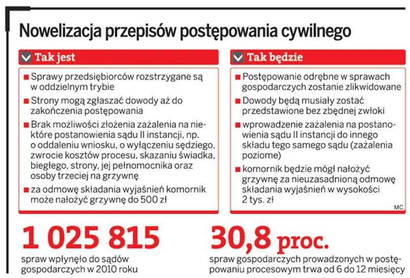 Eksperci przekonują jednak, że o ile likwidacja odrębnego trybu postępowania przed sądami gospodarczymi ma sens, to rozszerzenie prekluzji dowodowej (obowiązku niezwłocznego przedstawiania dowodów) na zwykłych klientów sądu jest nieporozumieniem.
