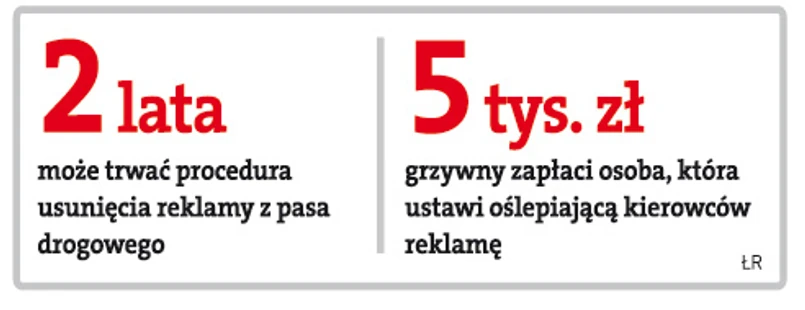 Obowiązujące dziś przepisy o jaskrawych reklamach są skomplikowane i pełne luk. W ustawie – Prawo o ruchu drogowym jest co prawda zakaz montowania przy drogach oślepiających ekranów, ale brakuje artykułu przewidującego karę za złamanie prawa. Jednocześnie usunięcie jaskrawego billboardu znajdującego się przy drodze jest bardzo trudne.