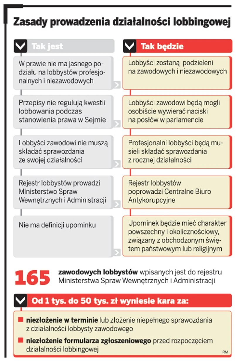 Nowe przepisy mają objąć zarówno lobbing zawodowy, jak i niezawodowy. Lobbystą zawodowym będzie ten, kto dostaje wynagrodzenie za to, co robi, i znajdzie się w specjalnym rejestrze lobbystów. Osoba, która wywiera wpływ na polityków i nie otrzymuje z tego tytułu