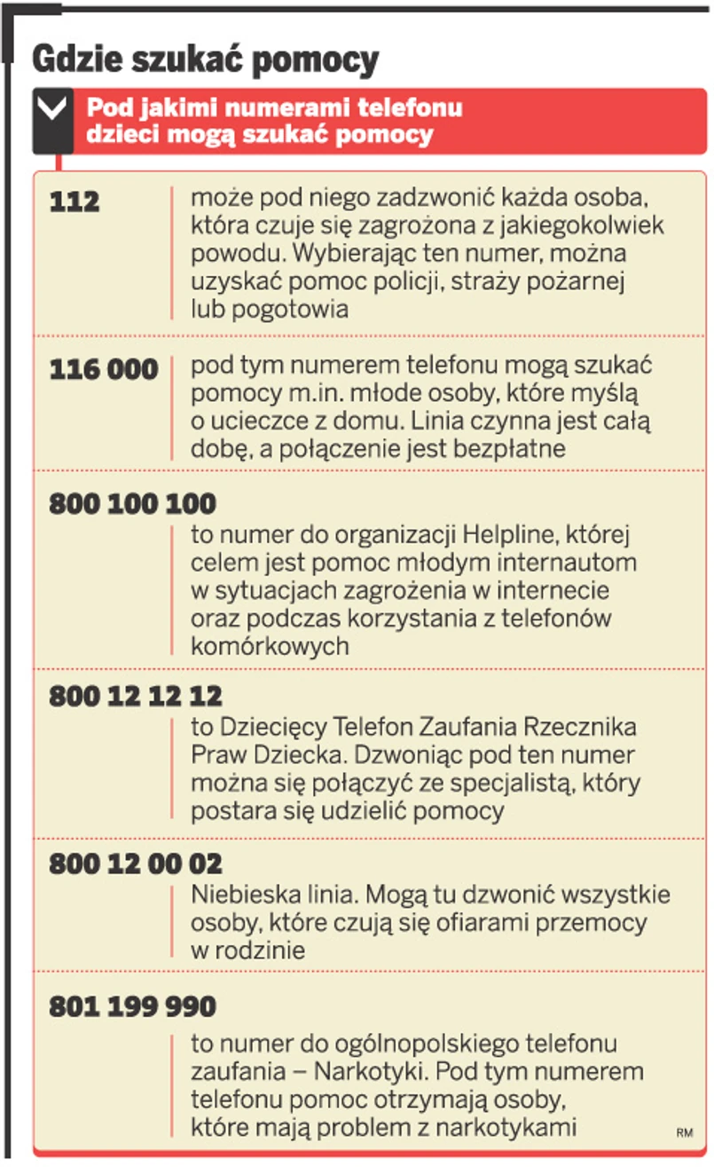 – Może to być pedagog szkolny, pani w świetlicy, rodzic koleżanki. Pokrzywdzone dziecko może też zadzwonić do telefonu zaufania i tam uzyskać poradę specjalisty – wyjaśnia Jolanta Zmarzlik, dyrektor Fundacji Dzieci Niczyje.