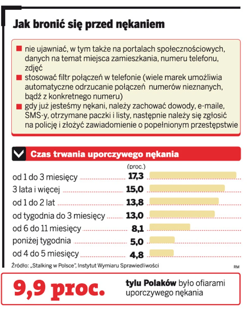 Przygotowanie odpowiednich przepisów w zakresie uporczywego nękania poprzedziliśmy dogłębnym badaniem i analizą, które na moje zlecenie przeprowadził Instytut Ekspertyz Sądowych. Wyniki badań zadziwiły nas wszystkich. Jak się bowiem okazuje, skala zjawiska, jakim jest stalking, czyli uporczywe nękanie, jest w Polsce bardzo duża. Co dziesiąty badany wskazuje, że był jego ofiarą. Sposób szykanowania ofiar podejmowany przez sprawców był niezmiernie zróżnicowany. Najczęściej – zdaniem respondentów – polegał na rozpowszechnianiu plotek i oszczerstw, nawiązywaniu kontaktu za pomocą osób trzecich, groźbach lub szantażu, częstych głuchych lub obscenicznych telefonach, groźbach pod adresem najbliższych, niechcianych listach, e-mailach lub SMS-ach, niechcianym robieniu zdjęć, niszczeniu rzeczy, niechcianym dotyku, upublicznieniu wizerunku ofiary i innych. Ponad połowa pokrzywdzonych miała w związku z takim zdarzeniem problemy natury emocjonalnej lub inne natury psychicznej. Wskazywano najczęściej na przygnębienie, utratę poczucia bezpieczeństwa i strach, a także złość i irytację. Co trzecia ofiara obawiała się wyjścia z domu, co czwarta deklarowała objawy agresji lub rozkojarzenia. Dlatego zdecydowaliśmy się na opracowanie przepisów, które okażą się skuteczną odpowiedzią na to, powiązane m.in. z rozwojem nowoczesnych technologii, zjawisko.