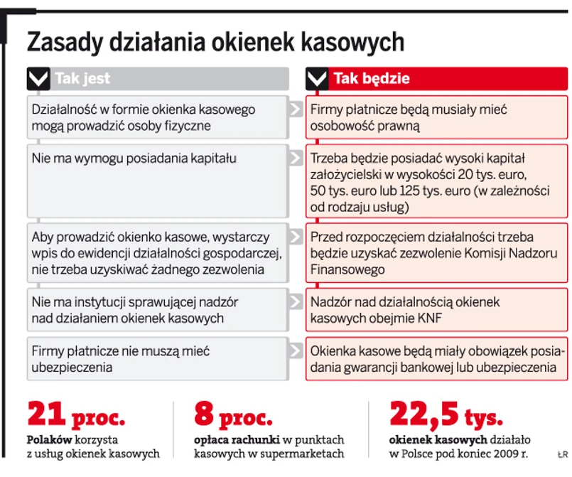 Dziś okienko kasowe może założyć każdy. Nie trzeba uzyskiwać żadnych zezwoleń ani posiadać kapitału. Wystarczy wpis do ewidencji działalności gospodarczej. Przedsiębiorcy tacy nie muszą mieć umowy ubezpieczenia, gwarancji bankowej ani zabezpieczenia finansowego w odpowiedniej wysokości. Dlatego też klienci korzystający z usług okienek kasowych nie mogą być pewni, czy ich pieniądze trafią na konta adresatów przelewów.