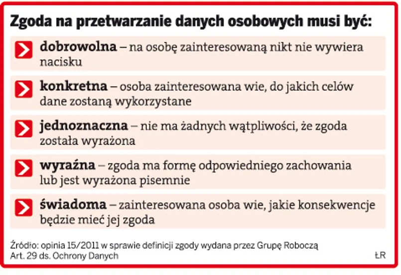 Generalny inspektor ochro- ny danych osobowych uspokaja, że opinia grupy roboczej nie wpłynie na zmianę podstawowych elementów zgody. Nadal będzie ona musiała być dobrowolna, a osoba, która ją wyrazi, będzie musiała być świadoma tego, na co się decyduje. Według opublikowanej opinii grupy roboczej zgody nie można bowiem wyrazić przez milczenie i pasywne zachowanie.