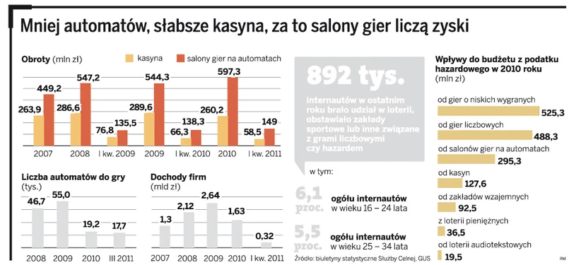 Nowa ustawa hazardowa, która weszła w życie od stycznia 2010 r., zadziałała za to w innym aspekcie. Liczba automatów o niskich wygranych miała spaść. I spadła. Jak wynika z najnowszego biuletynu Służby Celnej, pod koniec 2009 roku było ich ponad 55 tys., a na koniec marca tego roku zaledwie 17 tys. Spadły też dochody ich właścicieli z 2,6 mld zł w 2009 roku do 1,6 mld w ubiegłym. Podobne skutki nowe prawo przyniosło większości branży hazardowej. Kiedy w 2009 roku przychody firm hazardowych działających w Polsce przekroczyły 20 mld zł, to w 2010 roku po wejściu w życie nowego prawa hazardowego wyniosły już tylko 16,3 mld.