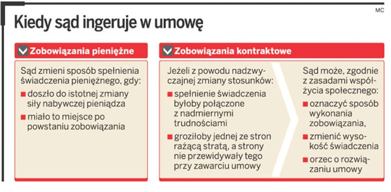 W kodeksie cywilnym pozostał jednak trzeci przepis, który wprowadza nierówność stron, jeżeli chodzi o kontakty banku z klientami. Zgodnie z art. 3581 par. 3 ustawy – Kodeks cywilny (Dz.U. z 1964 r. nr 16, poz. 93 z późn. zm.) w razie istotnej zmiany siły nabywczej pieniądza po powstaniu zobowiązania sąd może po rozważeniu interesów stron, zgodnie z zasadami współżycia społecznego, zmienić wysokość lub sposób spełnienia świadczenia pieniężnego, chociażby były ustalone w orzeczeniu lub umowie. Przepis ten nie obejmuje jednak umów zawieranych z bankami.