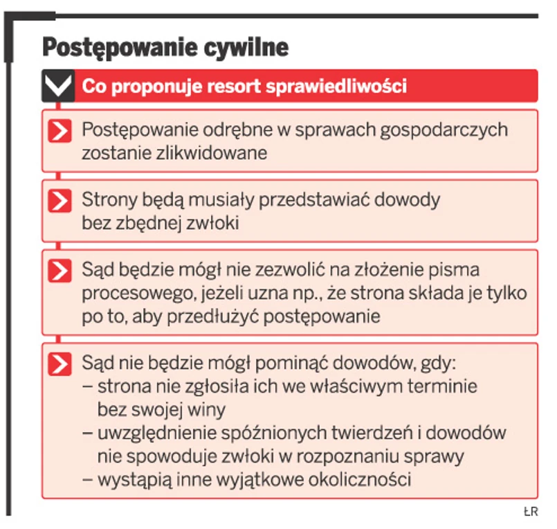 Projekt tzw. dużej nowelizacji kodeksu postępowania cywilnego powstał w komisji kodyfikacyjnej działającej przy ministrze sprawiedliwości. Jego głównym celem jest zlikwidowanie odrębnej procedury gospodarczej. Zdaniem resortu spory pomiędzy przedsiębiorcami powinny być rozpatrywane w takim samym trybie jak między innymi obywatelami. Wszystko dlatego, że obecne postępowanie gospodarcze jest zbyt sformalizowane.