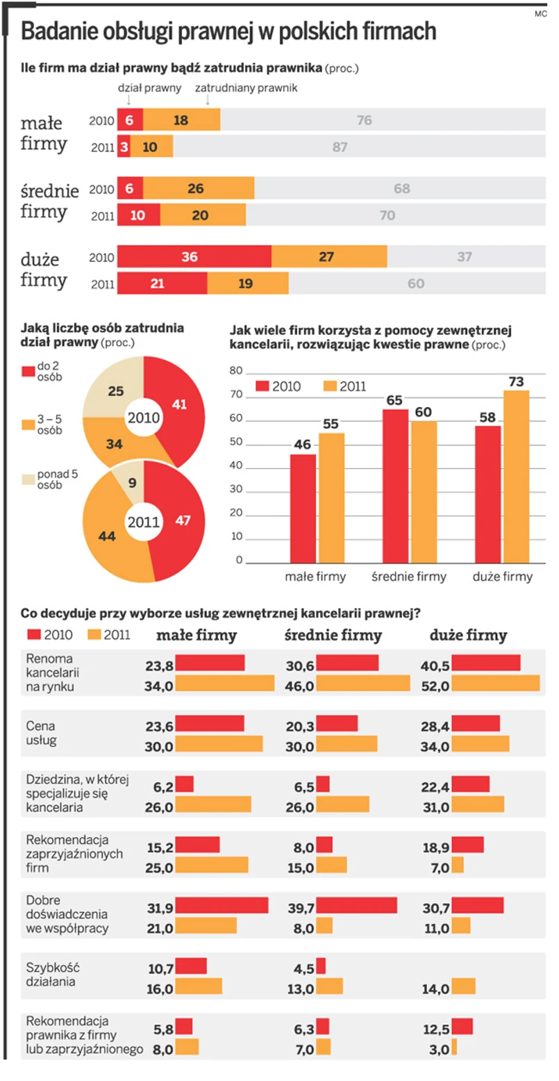 Z badania wynika, że duży odsetek przedsiębiorców, zamiast zatrudniać prawnika w firmowych strukturach, zleca prowadzenie swoich spraw zewnętrznej kancelarii prawnej. Firmy, zwłaszcza duże, uważają, że jest to rozwiązanie korzystniejsze, bo mniej kosztowne. Aż 73 proc. respondentów z dużych firm pytanych o to, kto zajmuje się w firmie rozwiązywaniem kwestii prawnych, odpowiedziało, że zewnętrzna kancelaria. Ten model korzystania z usług prawnych wybiera także coraz więcej małych przedsiębiorców (wzrost z 55 proc. w 2009 roku do 65 proc. w bieżącym roku). Spada natomiast odsetek średnich przedsiębiorstw zainteresowanych współpracą z zewnętrzną kancelarią (z 65 proc. do 60 proc.).