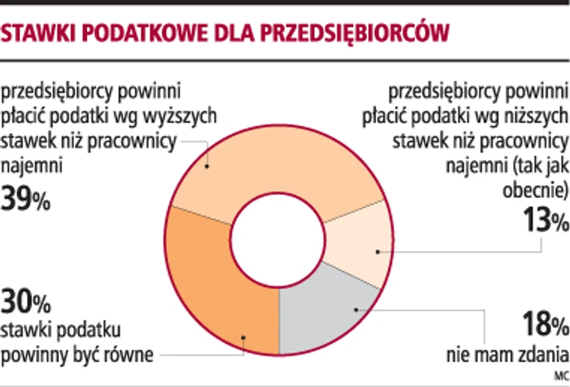 Niepokojący może być fakt, że tylko 13 proc. respondentów uznało, że przedsiębiorcy powinni płacić podatki według niższych stawek niż pracownicy najemni, podczas gdy aż 39 proc. uważa, że stawki te powinny być wyższe dla przedsiębiorców. Taki rozkład odpowiedzi może bowiem wskazywać na brak zrozumienia podstaw funkcjonowania przedsiębiorców i przywiązania do pracy na etacie. Przedsiębiorca ponosi ryzyko związane z prowadzoną przez siebie działalnością gospodarczą - może ponieść stratę z tego tytułu, co nie grozi pracownikowi najemnemu. Sytuacja przedsiębiorcy jest analogiczna do sytuacji osoby prawnej, dlatego dzisiejsza regulacja zrównuje stawki podatkowe dla tych dwóch grup w odróżnieniu od pracowników najemnych. Jednakże w odczuciu społecznym, którego wyrazem mogą być wyniki sondażu, przedsiębiorców należałoby ukarać stawką wyższą niż stosowana wobec pracowników najemnych. Ukarać najwyraźniej za przedsiębiorczość.
