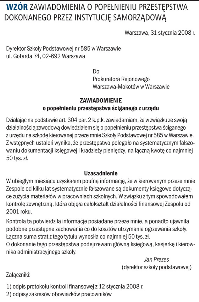 Wzór zawiadomienia o popełnieniu przestępstwa dokonanego przez instytucję samorządową