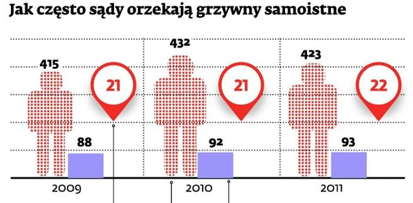 Okazuje się też, że większość orzekanych grzywien jest bardzo niska. Sądy wybierają zwykle karę w kwocie od 500 do 800 zł. Z danych Ministerstwa Sprawiedliwości wynika, że to ok. 24 tys. z ok. 93 tys. wszystkich grzywien orzeczonych w 2011 r.