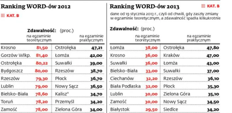 Drugi ogólnopolski ranking DGP dotyczący zdawalności w WORD-ach znacząco różni się od pierwszego zestawienia, które publikowaliśmy w lutym. Wtedy gorzowski WORD znajdował się w ścisłej czołówce zdawalności części teoretycznej (81,4 proc. skuteczności). Ale zajmująca teraz pierwsze miejsce Łomża w zeszłym roku też mogła się pochwalić zdawalnością teorii na poziomie 76 proc.