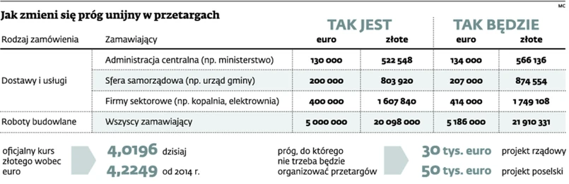 kurs ma być określony na 4,2249 zł. W praktyce więc próg unijny przy zamówieniach samorządowych na dostawy lub usługi, który dzisiaj wynosi niespełna 804 tys. zł, zostanie podwyższony do prawie 875 tys. zł. Przy robotach budowlanych to odpowiednio: mniej niż 20,1 mln zł oraz nieco więcej niż 21,9 mln zł.