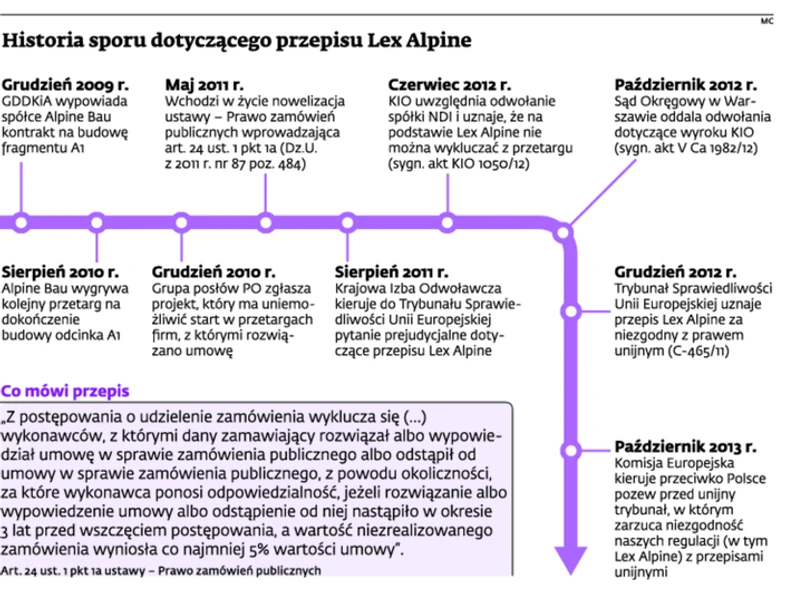 umowy (jeśli wartość niewykonanych prac wynosi co najmniej 5 proc. umowy). Przepis ten zwany jest potocznie Lex Alpine, gdyż uchwalono go po wydarzeniach na autostradzie A1. Z powodu opóźnień zerwano umowę z konsorcjum, na czele którego stała austriacka spółka Alpine Bau. Ta sama firma wróciła jednak później na plac budowy, bo wygrała kolejny przetarg.