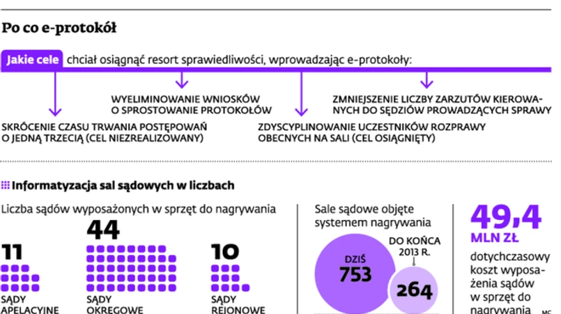 Czy to, że nie udało się dzięki e-protokołom skrócić znacząco czasu trwania postępowania, oznacza, że niemal 50 mln zł, które przeznaczono na wyposażenie sądów w sprzęt do nagrywania, zostało wyrzucone w błoto? Niekoniecznie. Resort przypomina, że nie tylko o przyśpieszenie tutaj chodziło.