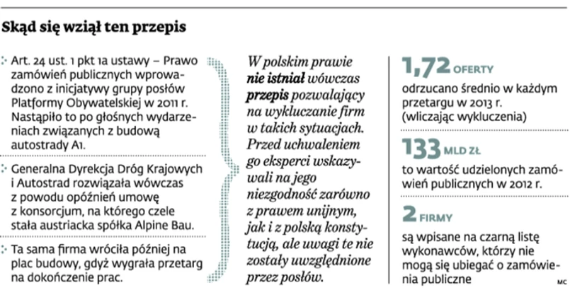 Chociaż minęło już ponad rok, rząd nie spieszy się ze zmianą niezgodnego z prawem UE przepisu. Może to dziwić, tym bardziej że został on dodatkowo zakwestionowany przez Komisję Europejską, która w październiku 2013 r. pozwała Polskę za niewłaściwą implementację prawa unijnego. Pozew ten dotyczy zresztą także innego przepisu o wykluczaniu z przetargów, a mianowicie art. 24 ust. 1 pkt 1 p.z.p. Chodzi o eliminowanie firm wpisanych na czarną listę prowadzoną przez prezesa UZP, które miały wcześniej wyrządzić szkodę przez nienależyte wykonanie (lub niewykonanie) zamówienia.