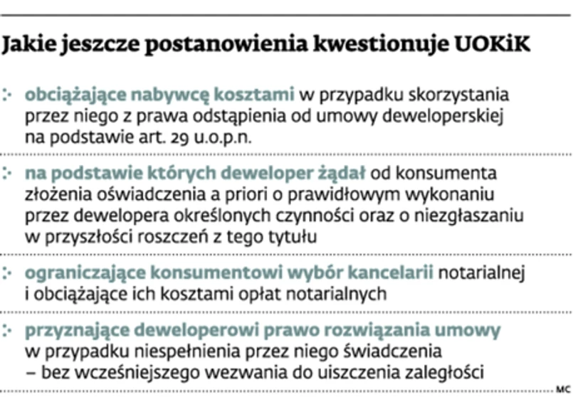 To jednak nie wszystkie uwagi urzędu, który punktuje deweloperów również za stosowanie klauzul zobowiązujących klienta do zrzeczenia się prawa zaskarżania rozstrzygnięć organów administracji związanych z realizacją kolejnych etapów inwestycji. „Równie często można się zetknąć z postanowieniami, w których deweloper zastrzega sobie nieodpłatne i nieograniczone w czasie użytkowanie fasady budynku jako powierzchni reklamowej, jak również prawo do zarządu budynkiem przez określony czas, wyłączając z niego zawiązującą się wspólnotę mieszkaniową” – wskazuje Dorota Grudzień-Barbachowska.