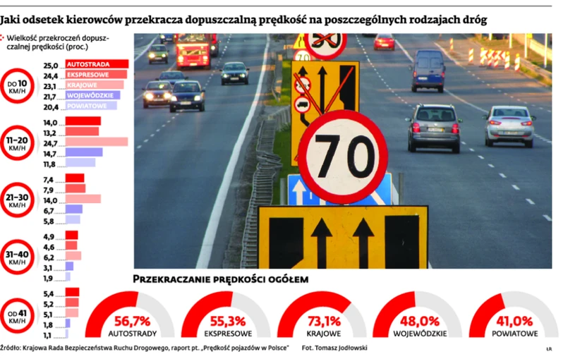 kierowcy, dotyczą właśnie przedziału 0–10 km/h. Przykładowo na drogach wojewódzkich dopuszczalne limity przekracza niemal połowa kierowców. W tym 22 proc. z nich przekroczyła prędkość o maksymalnie 10 km/h. A 5 proc. jechało 30 km/h i więcej powyżej limitu. I tylko oni narażają się na mandat.