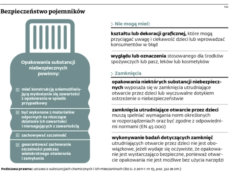 Co więcej, ustawodawca zarówno w obecnie obowiązującym rozporządzeniu w sprawie kategorii substancji niebezpiecznych i mieszanin niebezpiecznych, których opakowania wyposaża się w zamknięcia utrudniające otwarcie przez dzieci i wyczuwalne dotykiem ostrzeżenia o niebezpieczeństwie (Dz.U. z 2012 r. poz. 688 ze zm.) jak i w aktach wykonawczych obowiązujących w chwili wypadku, dopuszcza możliwość, że część dzieci odkręci butelkę zabezpieczoną w ten sposób. Zakrętkę uznaje się za bezpieczną wtedy, gdy 85 proc. dzieci nie jest jej w stanie odkręcić w ciągu trzech minut bez wskazówek, jak to zrobić.