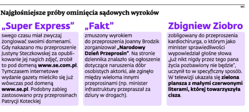 „Sąd nakazuje publikację oświadczenia o ww. treści na stronie głównej strony internetowej (...) w ramce o rozmiarach 10 x 10 cm, czarną czcionką na białym tle, tak aby wielkość czcionki była dostosowana do wielkości ramki, tj. ramka była w całości wypełniona oświadczeniem, przeprosiny winny znajdować się na stronie internetowej (...), zgodnie z podanymi zasadami nieprzerwanie przez okres 3 dni” – napisano z kolei w wyroku utrzymanym przez Sąd Apelacyjny w Warszawie (sygn. akt I ACa 765/13).