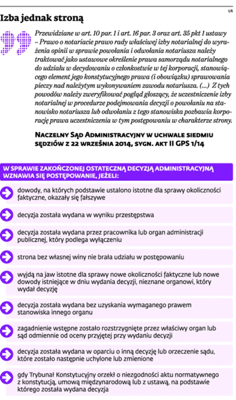 kodeksu postępowania administracyjnego. Izba notarialna – będąca stroną – nie brała bowiem udziału w postępowaniu nie z własnej winy – potwierdza dr Krzysztof Wąsowski, administratywista z Uniwersytetu Warszawskiego,