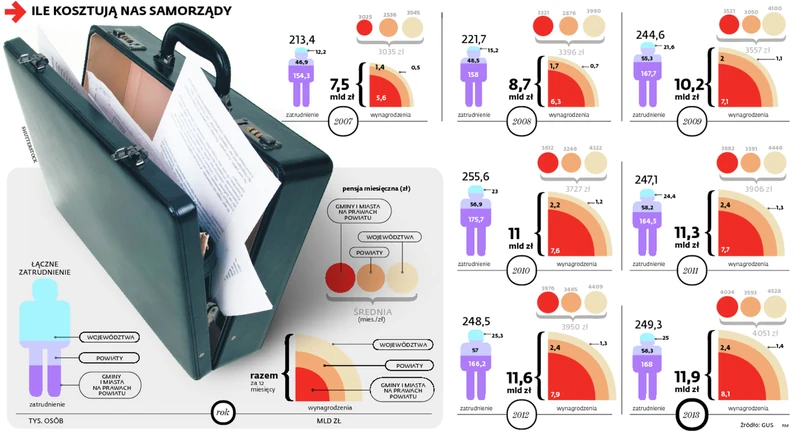Koszty z roku na rok rosną, na co składają się wzrosty zatrudnienia i pensji. W 2007 r. w gminnej oraz miejskiej administracji samorządowej pracowało ponad 154 tys. osób, niemal 47 tys. w powiatach i trochę ponad 12 tys. w województwach. To w sumie ponad 213 tys. ludzi. W ubiegłym roku liczba urzędników szczebla gminnego była aż o 9 proc. większa (wzrosła do 168 tys.), personel urzędów powiatowych zwiększył się o jedną piątą, do 56 tys., a 25-tysięczna armia w województwach powiększyła się w ciągu siedmiu lat aż o 108 proc.