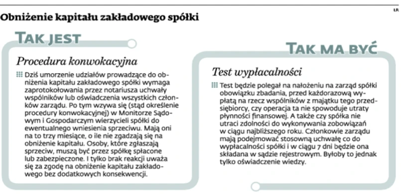 Co, jeśli firma mimo dokapitalizowania znajdzie się za jakiś czas ponownie w tarapatach? A inwestor – mając świadomość problemów i większość głosów na walnym zgromadzeniu – zechce umorzyć udziały beznominałowe za odpowiednio dużym wynagrodzeniem? Jeśli spółka z o.o. zostanie zbudowana, tak jak przewidują twórcy projektu, nie będzie musiała ogłaszać o tym i wzywać wierzycieli do złożenia sprzeciwów.